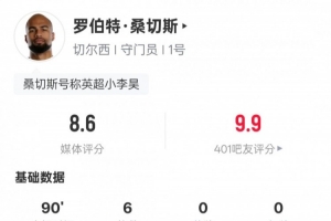 體育資訊1月18日訊 英超第22輪,切爾西2-0布倫特福德。本場(chǎng)比賽,藍(lán)軍首發(fā)門(mén)將羅伯特·桑切斯表現(xiàn)出色,貢獻(xiàn)全場(chǎng)最多的6次撲救,評(píng)分8.6全場(chǎng)最高。